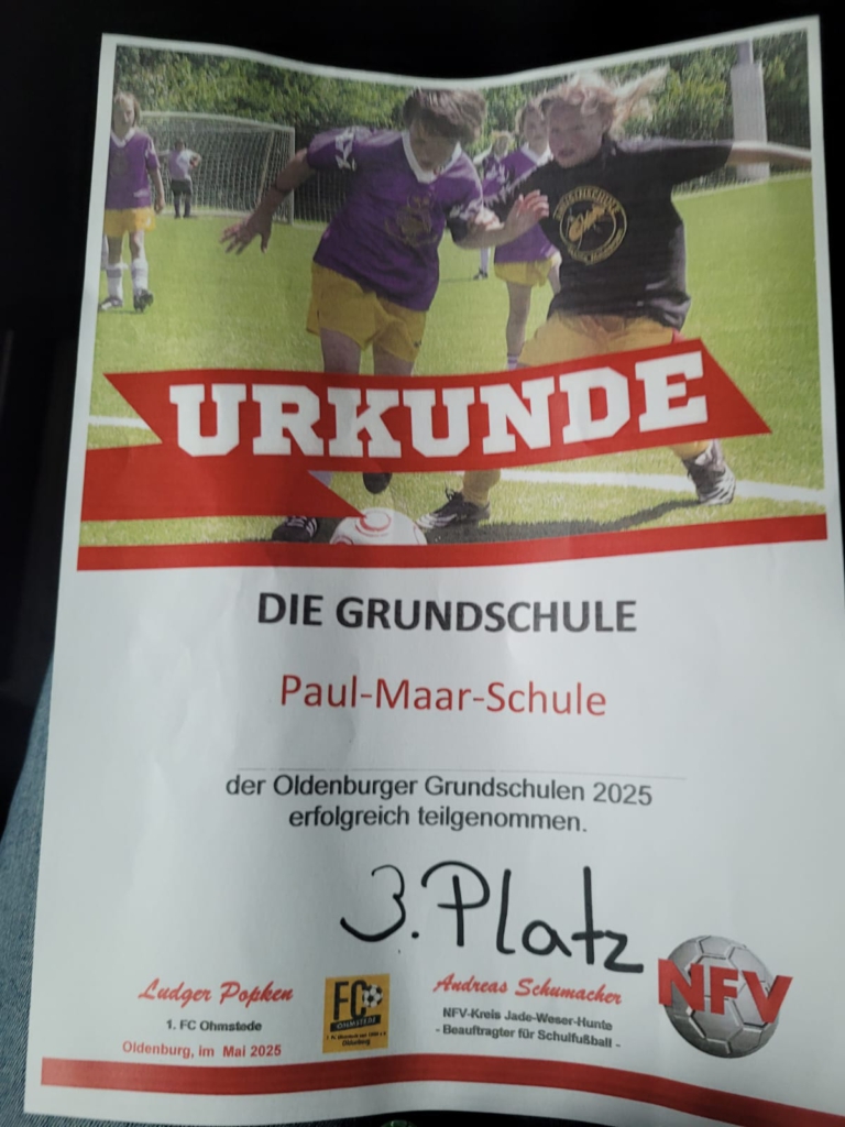 Auch die fußballbegeisterte Mannschaft der Paul-Maar-Schule nahm an den Vorentscheidungen teil und qualifizierte sich für die Endspiele, die am 27. Mai 2025 zur Ermittlung des Stadtmeisters der Oldenburger Grundschulen in Ohmstede stattfinden werden.