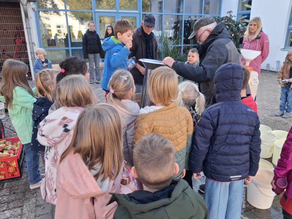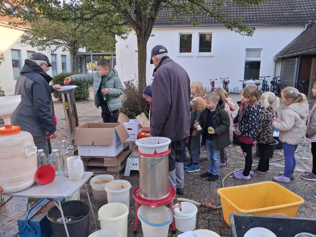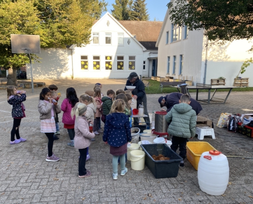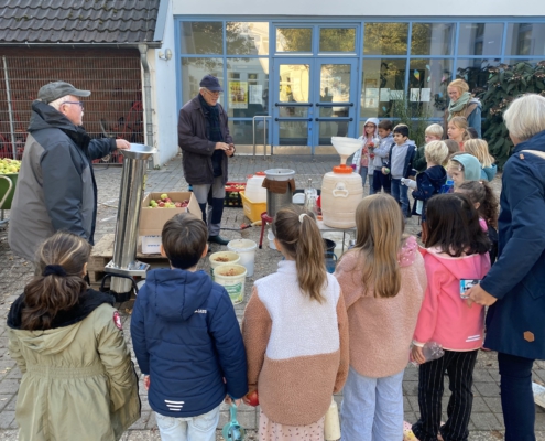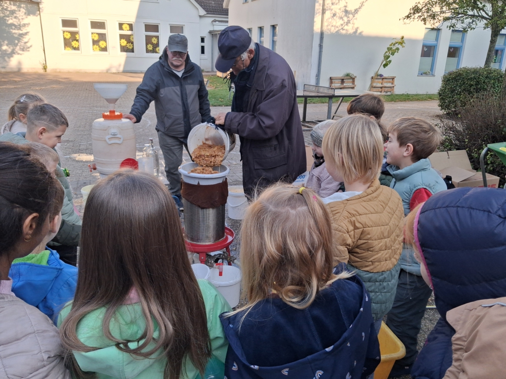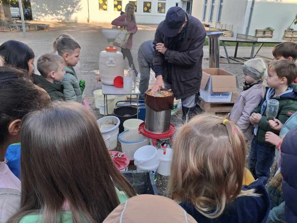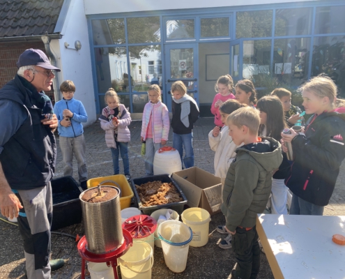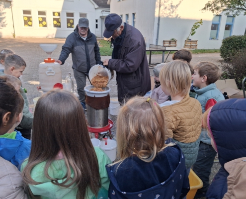 Das Highlight des Vormittags war die Apfelpresse! Zwei fachkundige Herren erklärten und zeigten den Schülerinnen und Schülern der Klassen eins bis vier, wie aus den Äpfeln Apfelsaft gemacht wird. Die Kinder waren interessiert bei der Sache, denn sie durften nicht nur selbst Äpfel in die Röhre, die den Apfel zu Brei presst, hineinwerfen, sondern sie konnten anschließend beobachten, dass nach starkem Pressen des Apfelbreis und anschließendem Filtern Saft entstanden war, der mithilfe eines Hahnes aus dem Saftbehälter entnommen werden konnte. Die Kinder hatten ihre Trinkflaschen mitgebracht und durften sich den superfrischen Apfelsaft hineinfüllen. Der Saft schmeckte sooo lecker!
