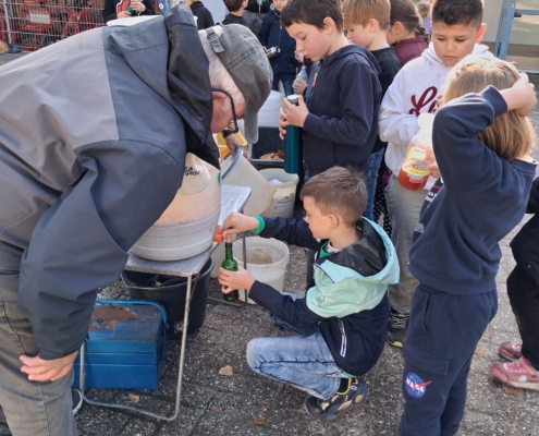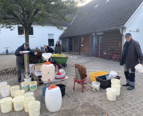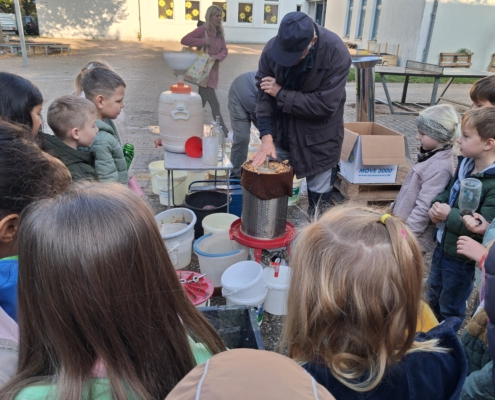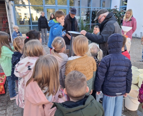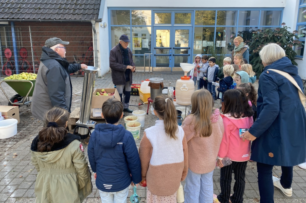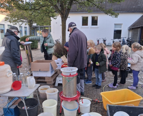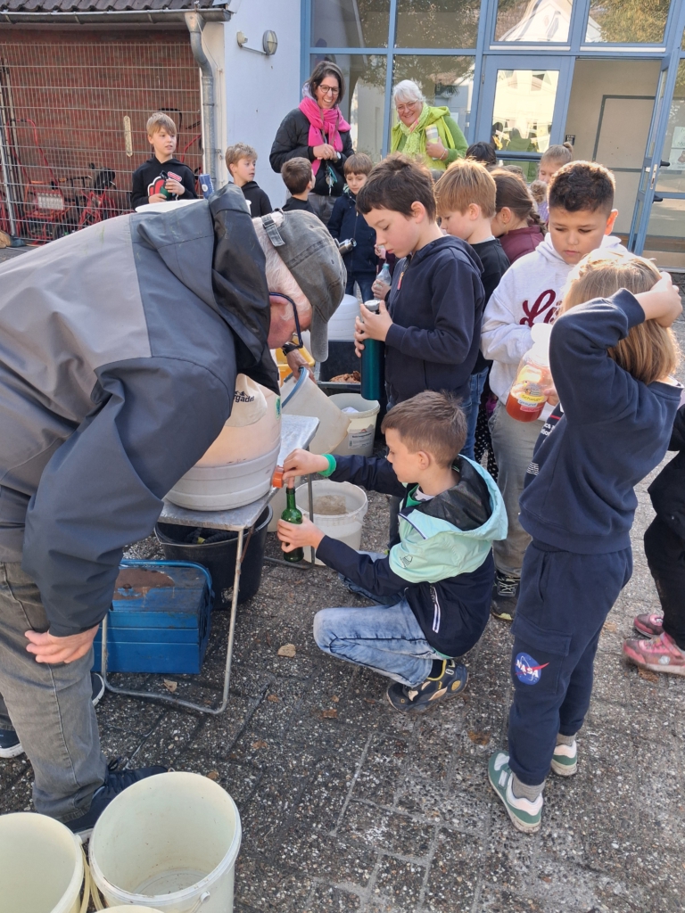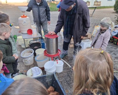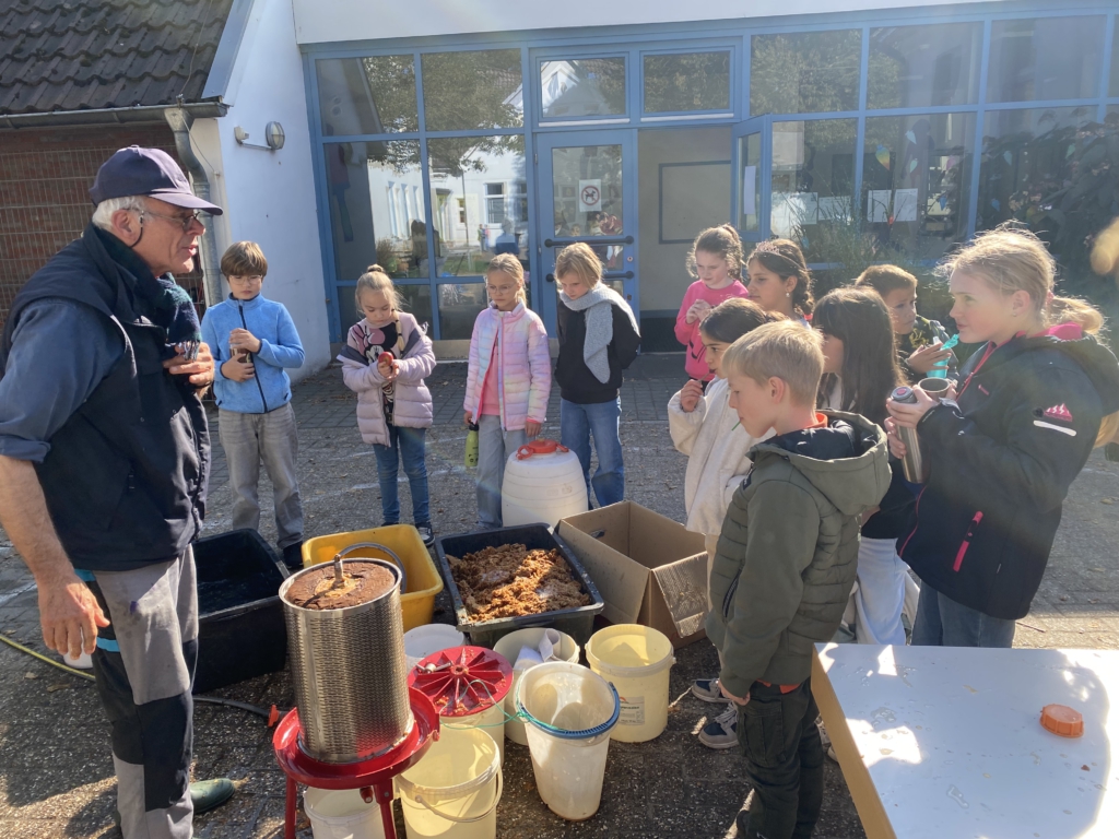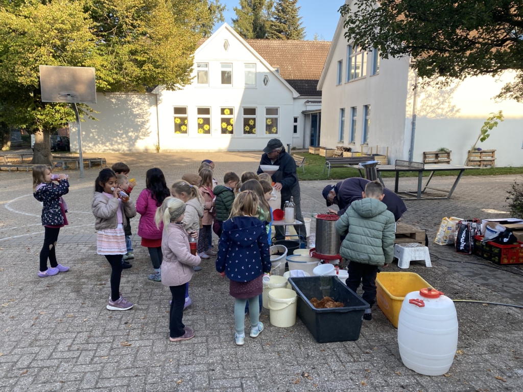 Das Highlight des Vormittags war die Apfelpresse! Zwei fachkundige Herren erklärten und zeigten den Schülerinnen und Schülern der Klassen eins bis vier, wie aus den Äpfeln Apfelsaft gemacht wird. Die Kinder waren interessiert bei der Sache, denn sie durften nicht nur selbst Äpfel in die Röhre, die den Apfel zu Brei presst, hineinwerfen, sondern sie konnten anschließend beobachten, dass nach starkem Pressen des Apfelbreis und anschließendem Filtern Saft entstanden war, der mithilfe eines Hahnes aus dem Saftbehälter entnommen werden konnte. Die Kinder hatten ihre Trinkflaschen mitgebracht und durften sich den superfrischen Apfelsaft hineinfüllen. Der Saft schmeckte sooo lecker!