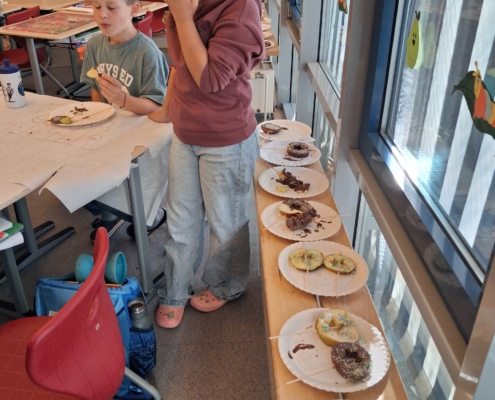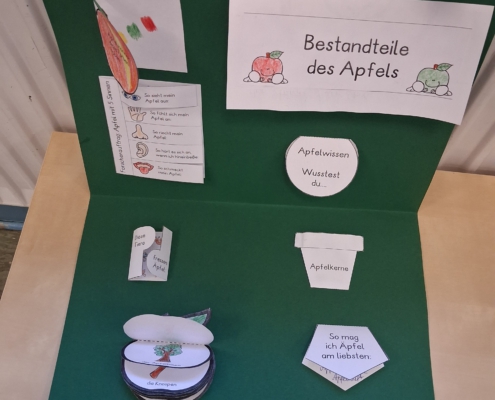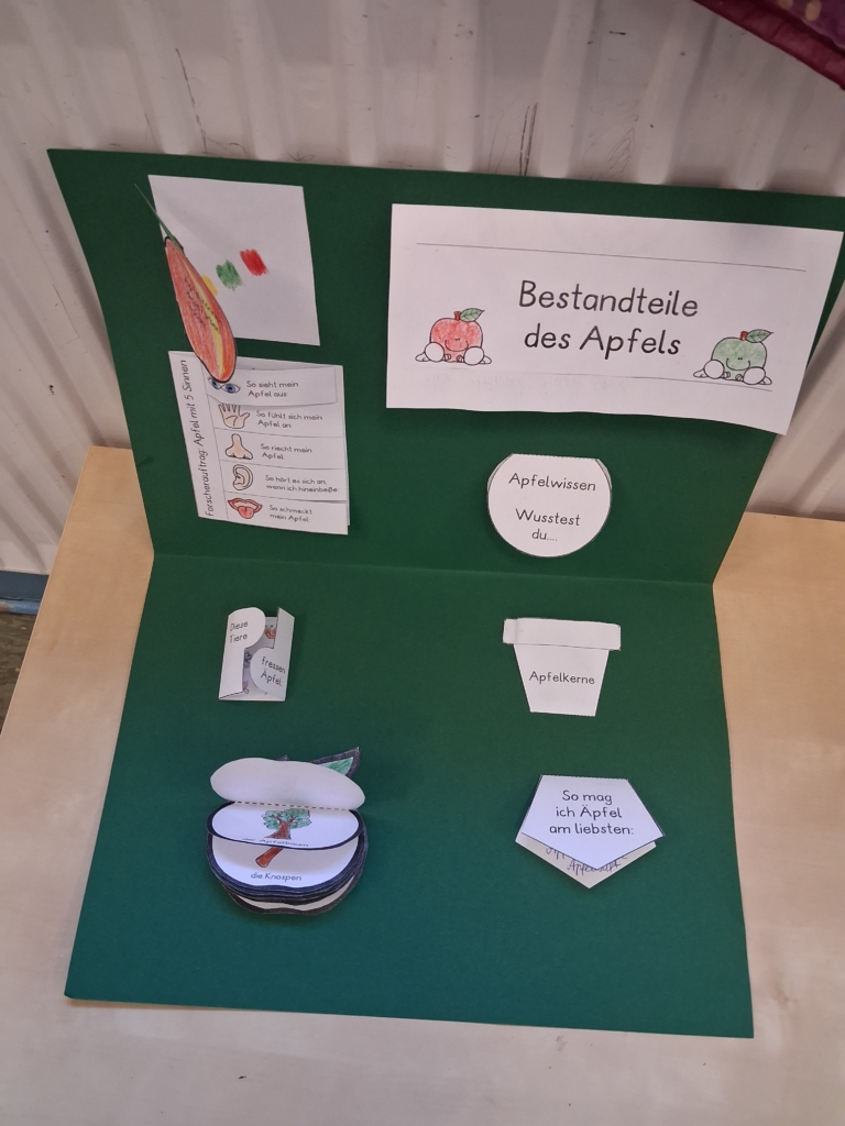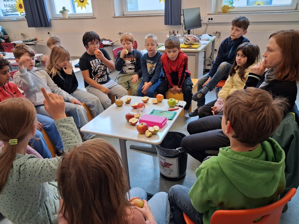 Zum Thema Apfel gehört auch, dass man die Bauteile dieser Frucht kennenlernt, oder durch Probieren verschiedener Äpfel erfährt, dass Geschmack und Konsistenz bei unterschiedlichen Apfelsorten variieren. Zu diesen Bereichen arbeiteten zum Beispiel Klasse 3b und 3d.