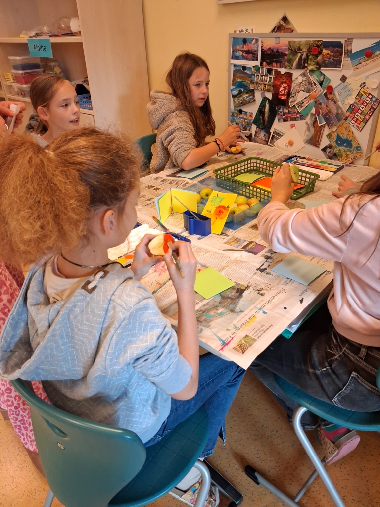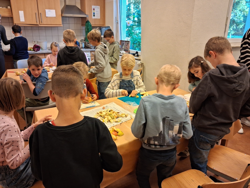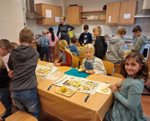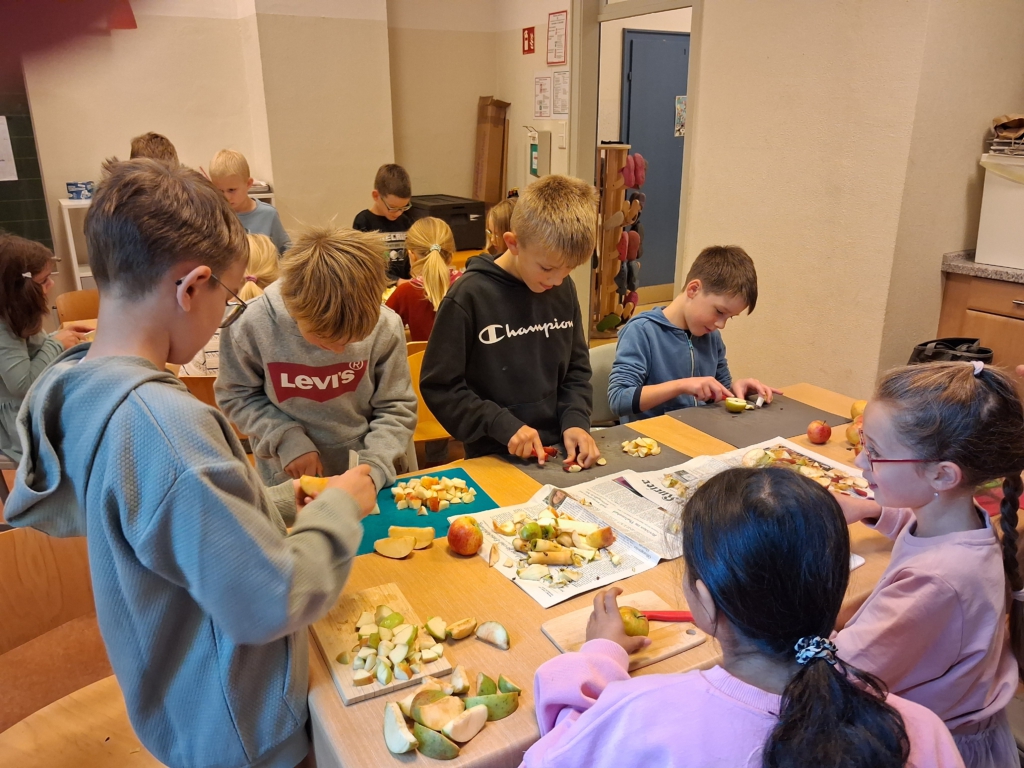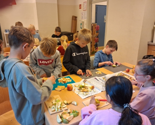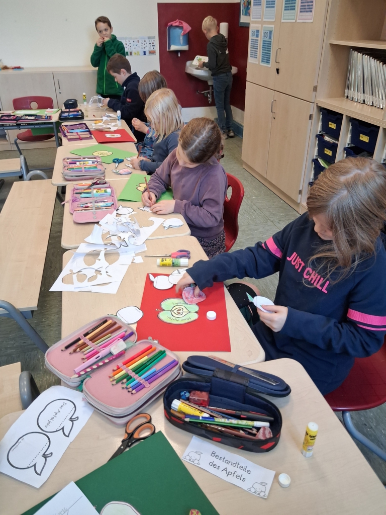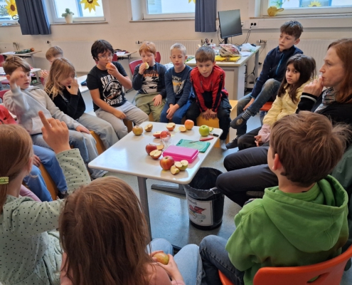 Am Donnerstagvormittag, dem 2. Oktober 2025 waren die Unterrichtstunden dem Projekt Apfel gewidmet. Die Schülerinnen und Schüler der Klassen eins bis vier beschäftigten sich auf verschiedene Art und Weise mit diesem Thema.