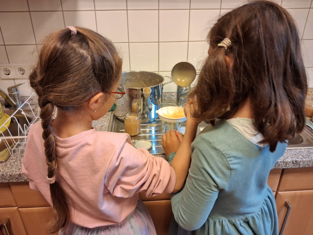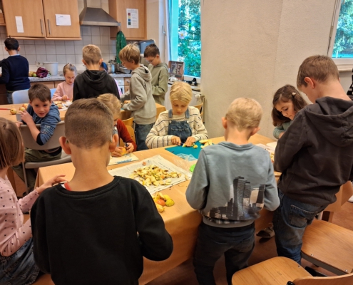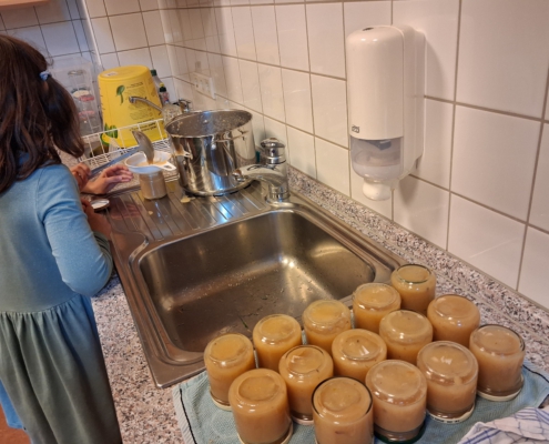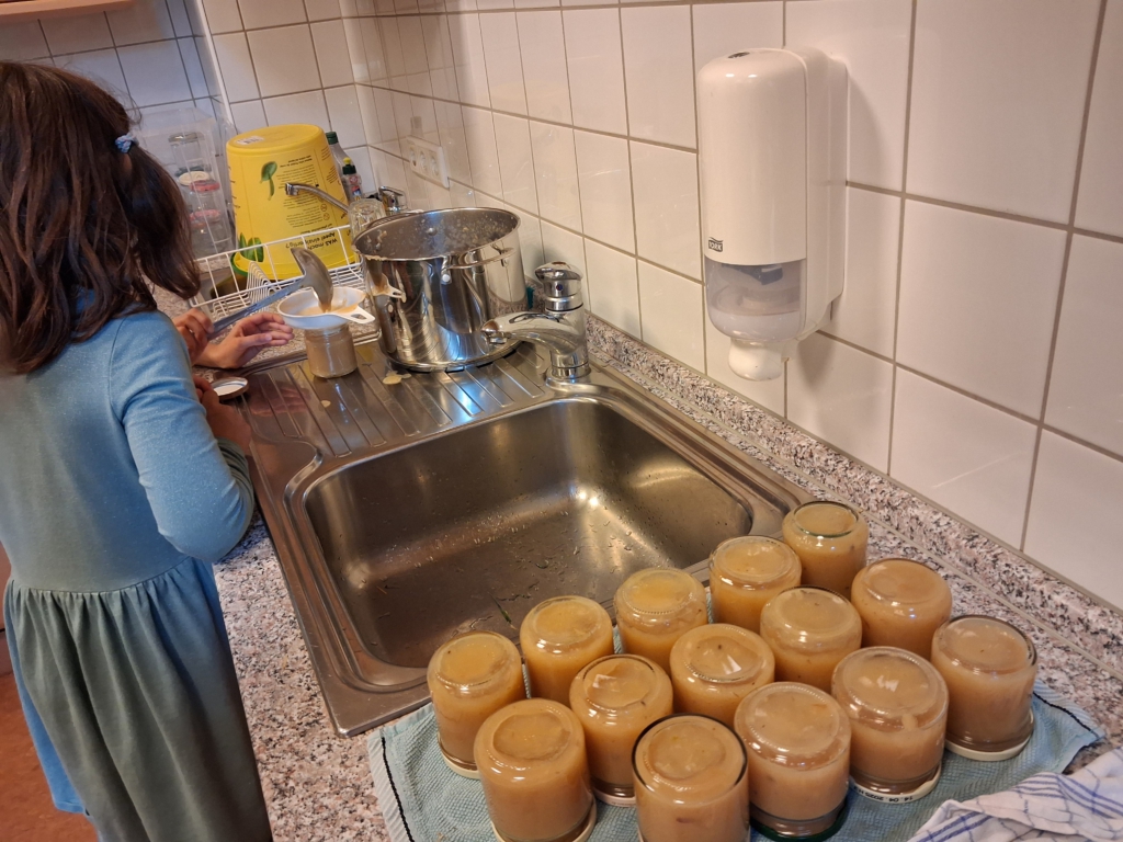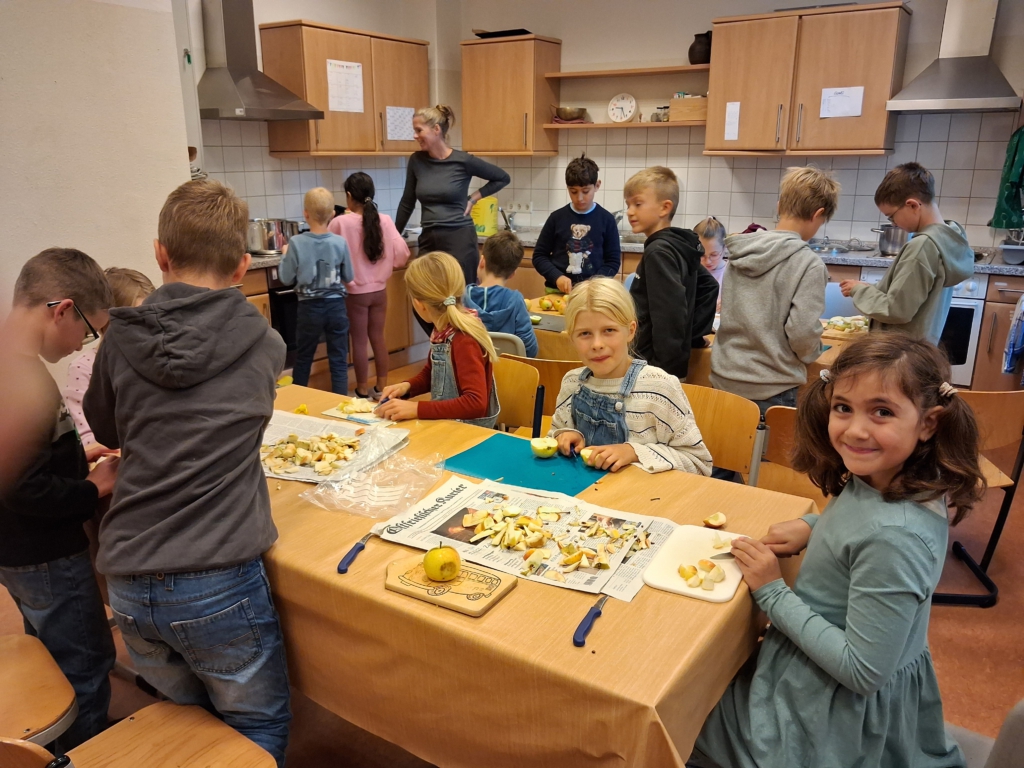 Die Mädchen und Jungen der Klasse 3c unter der Leitung von Frau Teebken wollten Apfelmus kochen. Dafür mussten zunächst die Äpfel gesäubert und anschließend entkernt sowie in kleine Stücke geschnitten werden. Die Kinder waren mit Freude und Ausdauer beim Äpfel schnippeln. Mehrere Töpfe voll Apfelmus wurden gekocht und in Gläser gefüllt, sodass jedes Kind Apfelmus probieren und auch ein Glas mit nach Hause nehmen konnte.
