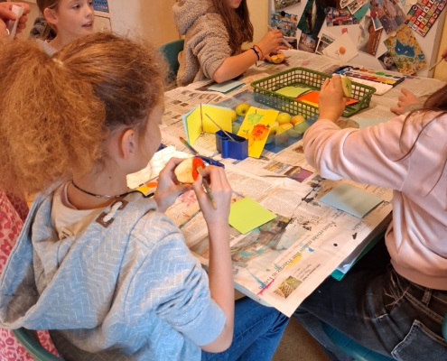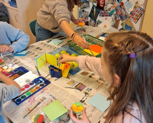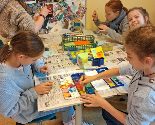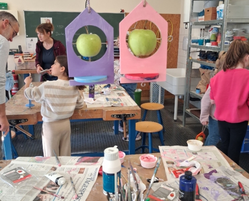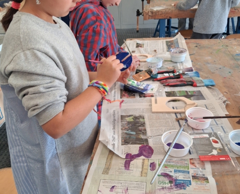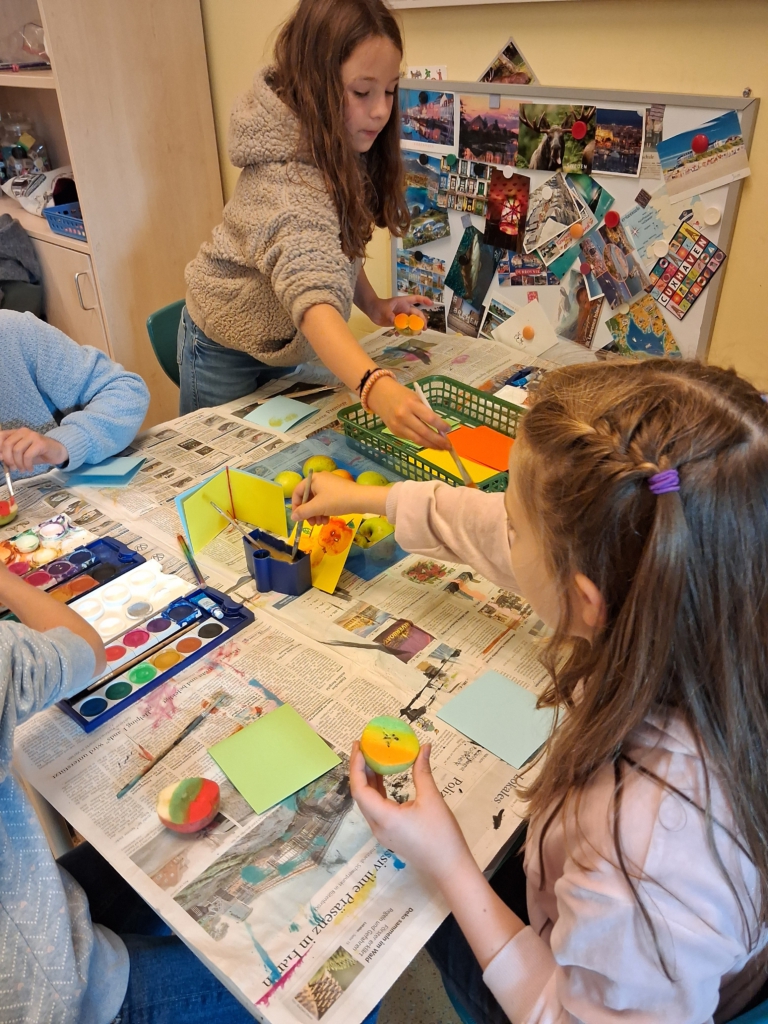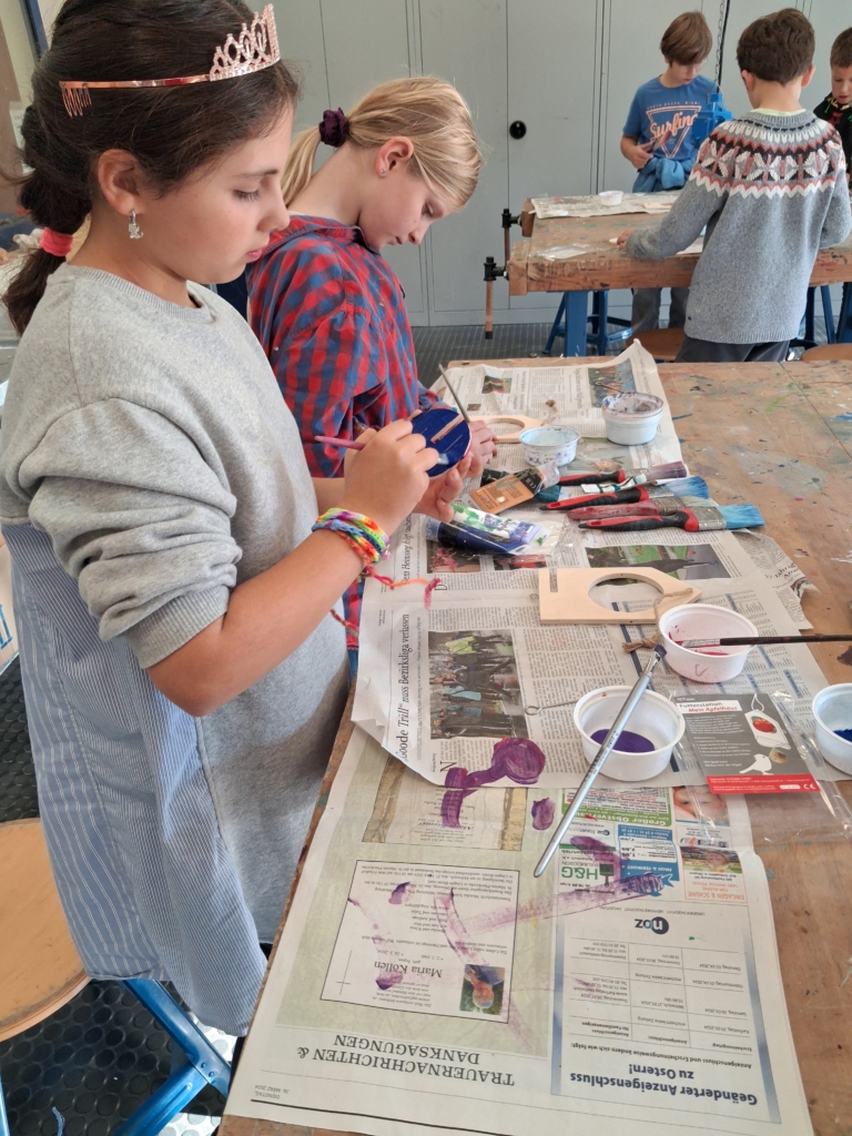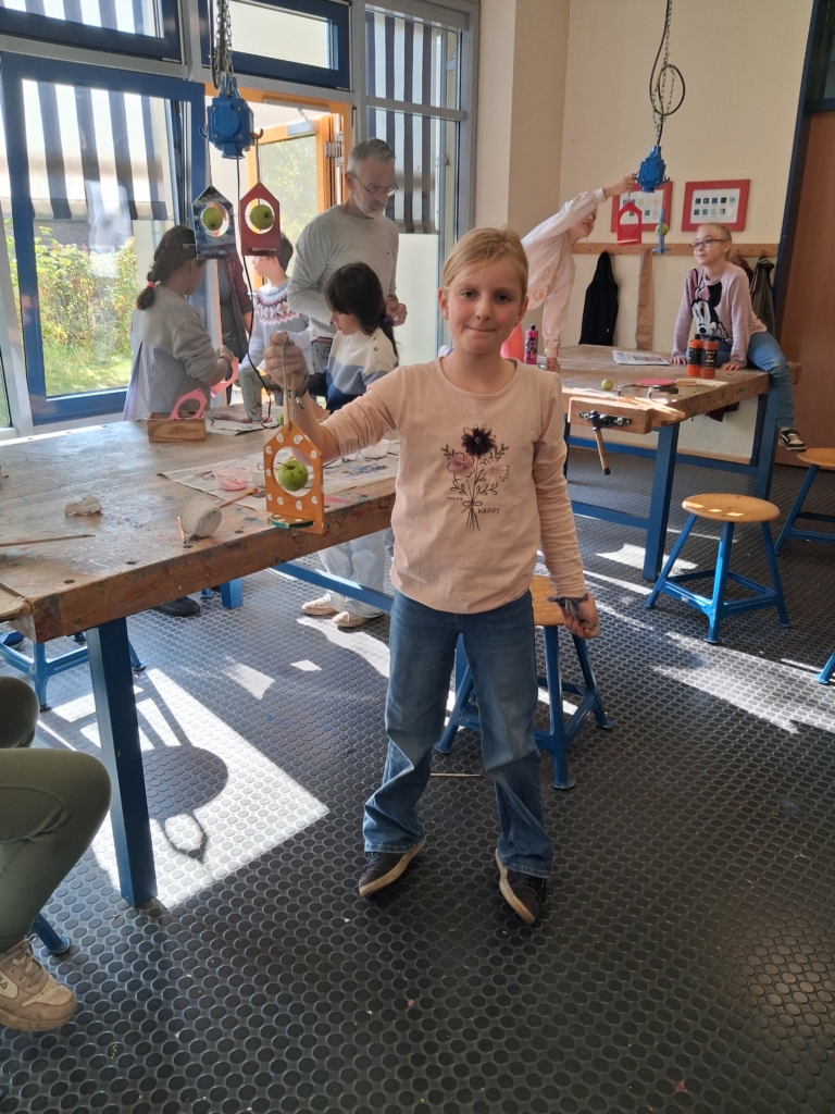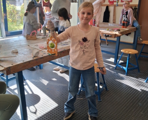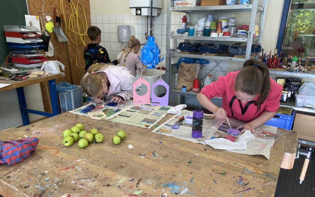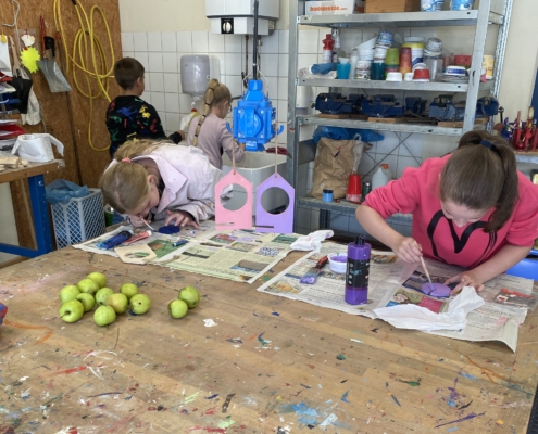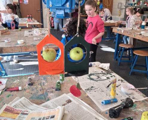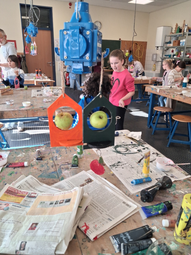 Im Werkraum bastelten die Schülerinnen und Schüler der Klasse 4b unter der Leitung von Frau Reershemius Apfelhäuser, die als Futterstelle für Vögel aufgehängt werden können. Die vorgeschnittenen Holzteile wurden mit wetterfester Farbe sehr farbenfroh bemalt, zusammengebaut und in der Mitte mit einem Apfel bestückt.