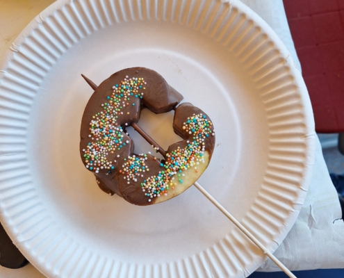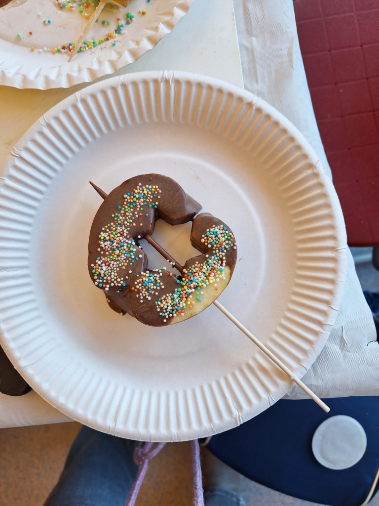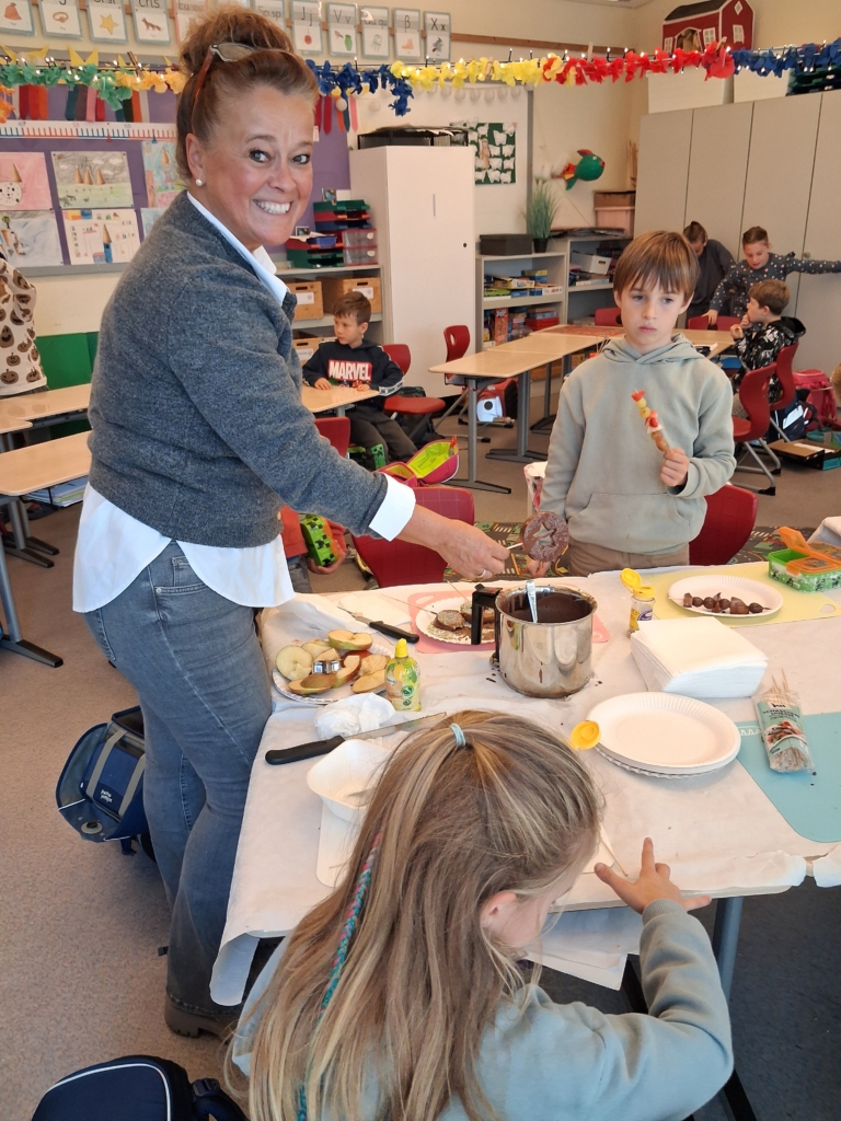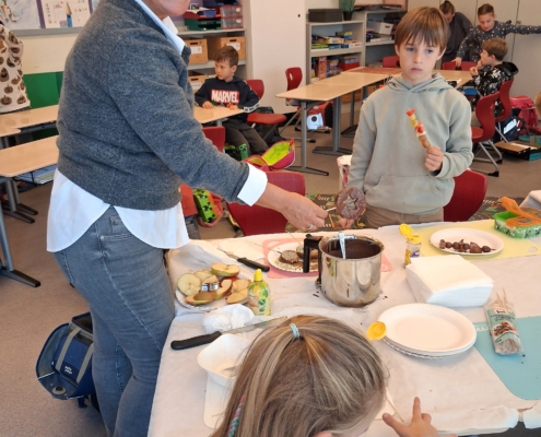 Die Kinder der Klasse 2b mit Frau Zuckmantel stellten leckere Apfellollies aus Apfelscheiben her, die mit Schokolade überzogen und mit Streuseln verziert wurden.