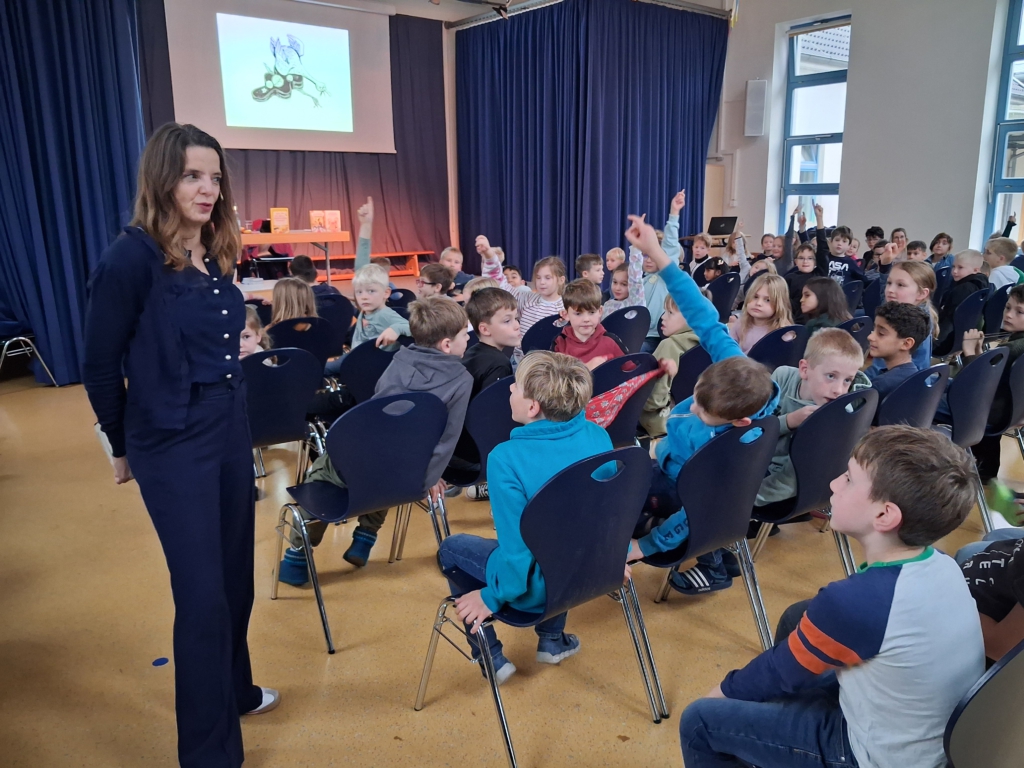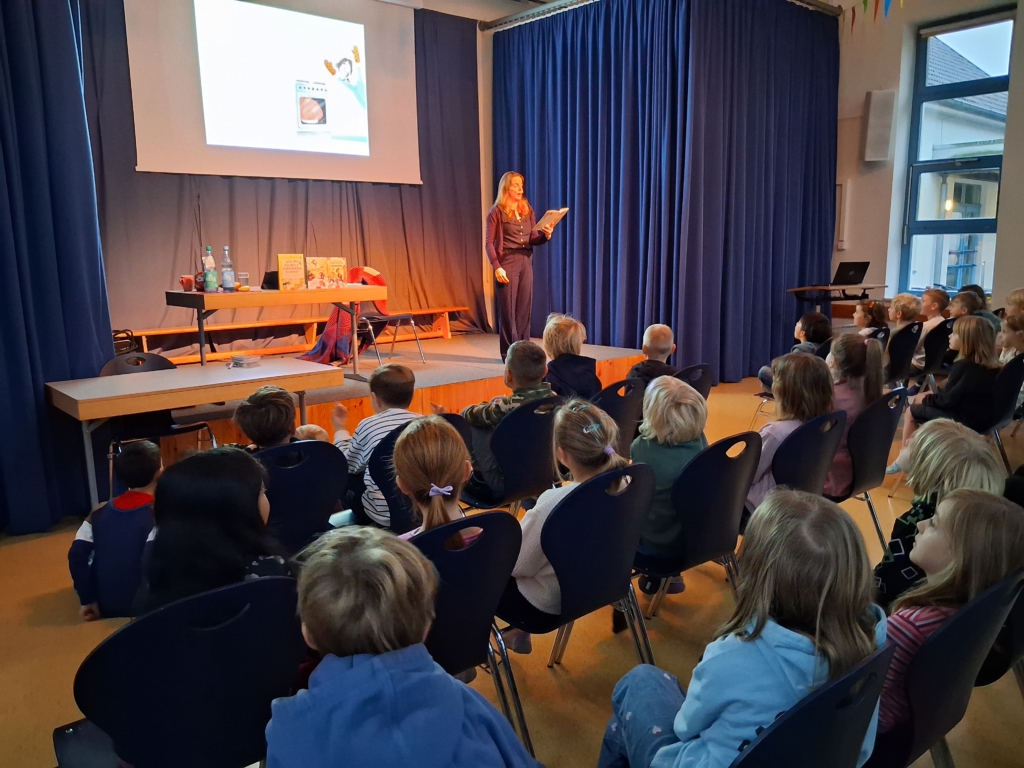 Für die drei ersten Klassen und zwei zweite Klassen las Sarah Welk zunächst aus ihrem Buch „Ziemlich beste Schwestern“, lustige Abenteuer mit den Schwestern Mimi und Flo. Nach einem Ratespiel mit der Autorin, hörten die Kinder die witzigen Geschichten mit drei Brüdern aus dem Buch „Ich und meine CHAOS-BRÜDER“.  Nach der Lesung durften sie der Autorin noch viele Fragen stellen.