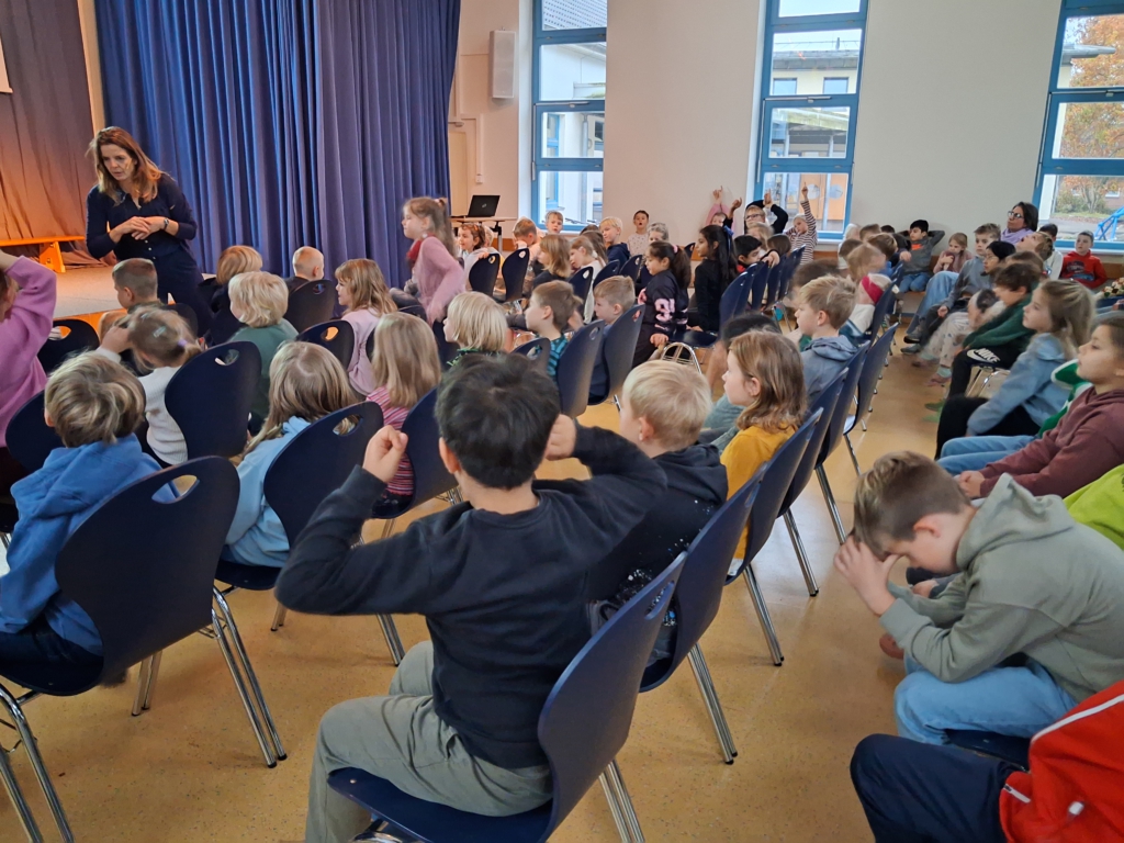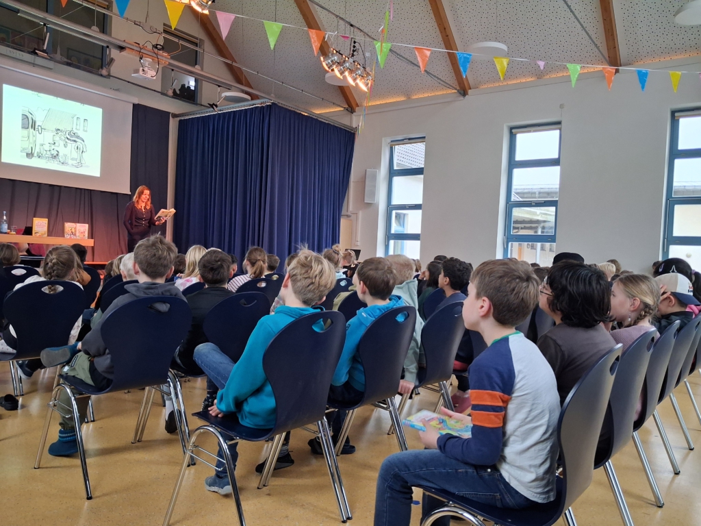 Die Schülerinnen und Schüler der vier dritten Klassen und einer zweiten Klasse lauschten den Geschichten aus dem Buch „Weihnachten mit Opa“, eine turbulente und lustige Weihnachtsgeschichte mit dem Hippie-Opa Franz. In einer anschließenden Fragerunde konnten die Kinder noch einiges über die Autorin erfahren.