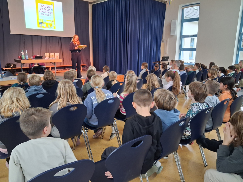 Für die Mädchen und Jungen der vierten Klassen hatte Sarah Welk das bunte, informative Sachbuch „Wie du die Welt verändern kannst – ob Familie, Schule oder das ganze Land – so funktioniert Demokratie“ mitgebracht. Mit interessanten Beispielgeschichten las und erzählte Sarah Welk, wie Demokratie funktioniert und wie auch Kinder in ihrem Alltag schon etwas verändern können.