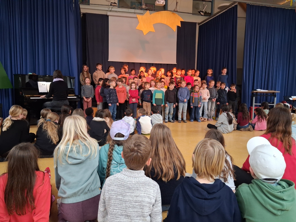 Zur Einstimmung auf die Ferien und das bevorstehende Weihnachtsfest trafen sich am Freitag, dem 19. Dezember 2025 die Schülerinnen und Schüler mit ihren Lehrerinnen und Lehrern im Forum.