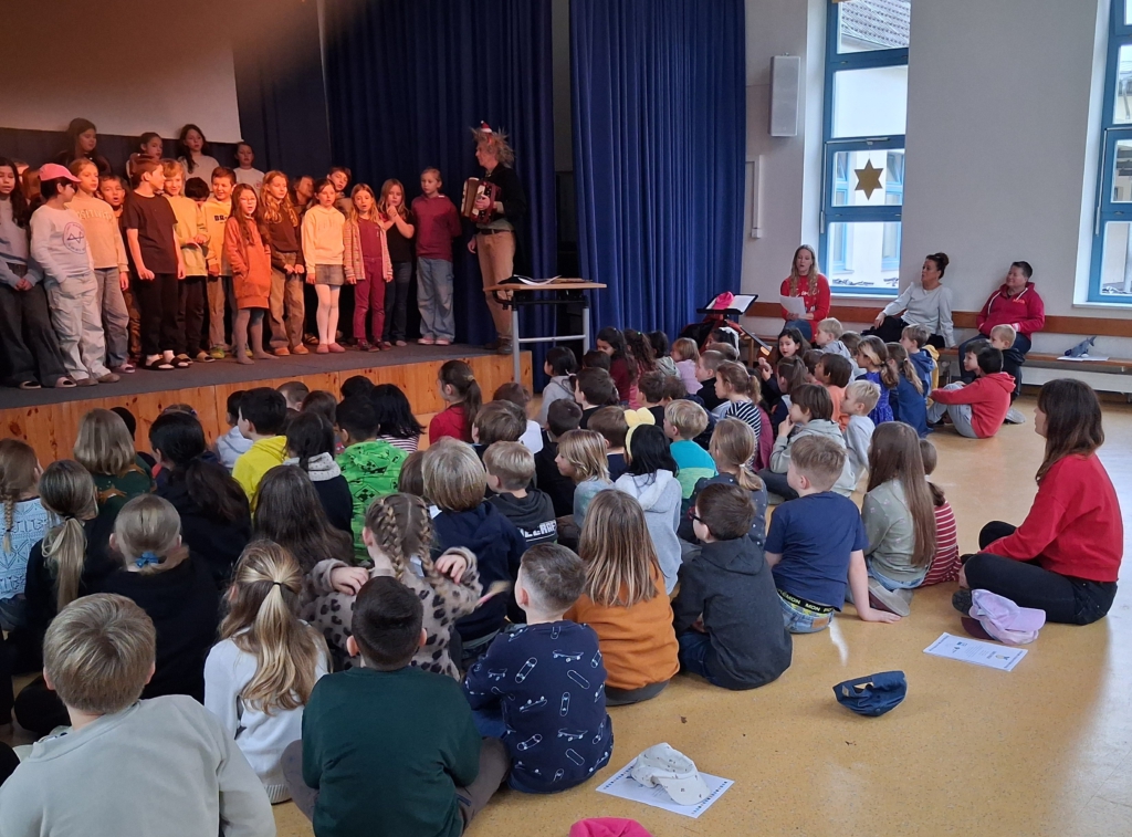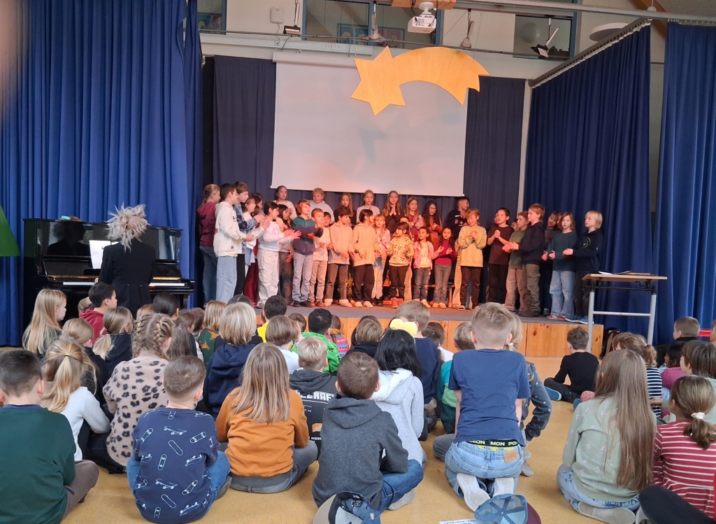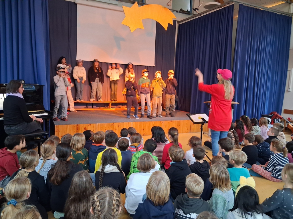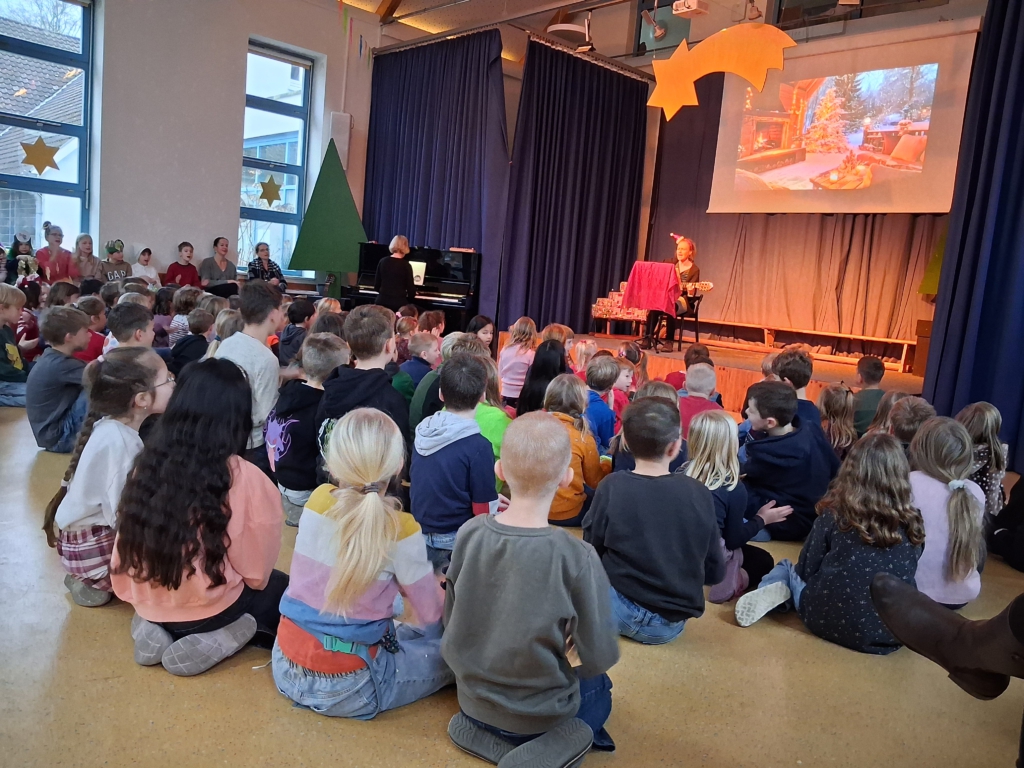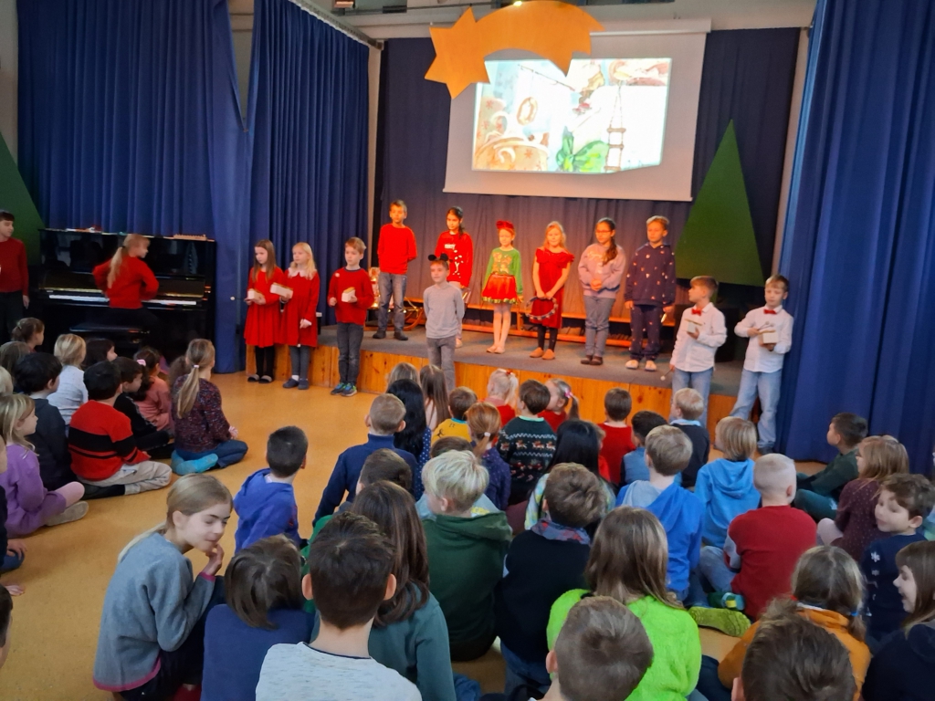 Die Schülerinnen und Schüler der Klassen 1b und 1c sangen gemeinsam das Lied: „Weihnachten will es werden“. Danach trugen die Mädchen und Jungen der Klasse 3a das Gedicht: „Die Weihnachtsmaus“ mit Musikbegleitung vor. Mehrere kleine Gedichte hatten die Kinder der Klasse 3d eingeübt. Ein kleines Theaterstück wurde von der Klasse 3b aufgeführt. Das Lied „In der Weihnachtsbäckerei“ durfte auch nicht fehlen und bildete den Abschluss.