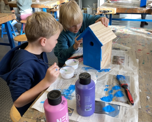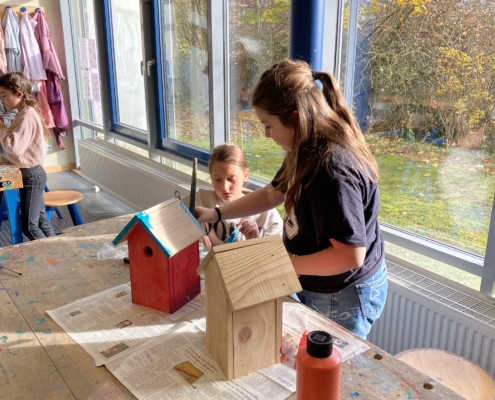 Nachdem alle Bauteile erfolgreich zusammengesetzt und verschraubt wurden, wurden die Nistkästen mit bunten Acrylfarben gestrichen und anschließend lackiert, damit sie vor Wind und Wetter geschützt sind. Auch das Dach wurde professionell gestaltet. Um es vor Nässe zu schützen, haben die Kinder Dachpappe entsprechend der Größe ausgemessen, zugeschnitten und unter Anleitung mit einem Tacker auf dem Dach fixiert.