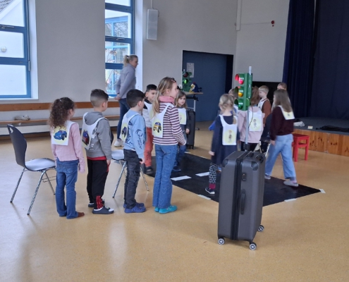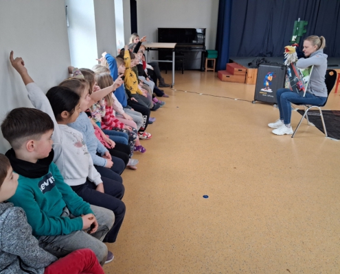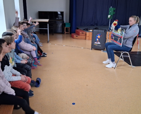 Für die Klassen 1a, 1b und 1c waren am Montag, dem 23. Februar 2026 jeweils eine Unterrichtsstunde eingeplant, in der Frau Bogus mit ihrer Handpuppe ADACUS die Mädchen und Jungen spielerisch an verkehrssicheres Verhalten als Fußgänger heranführte. Anhand von bildlich dargestellten Situationen im Straßenverkehr sollten die Kinder zunächst richtiges und falsches Verhalten erkennen und benennen. Danach folgten die praktischen Übungen, bei denen die Schülerinnen und Schüler das korrekte Verhalten beim Überqueren der Straße an einer Fußgängerampel erlernten. Das machte den Mädchen und Jungen besonders viel Spaß! Als Belohnung erhielt jedes Kind eine Urkunde und einen Aufkleber.