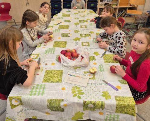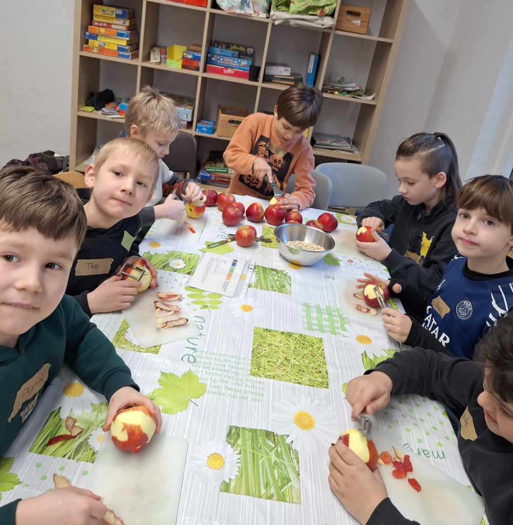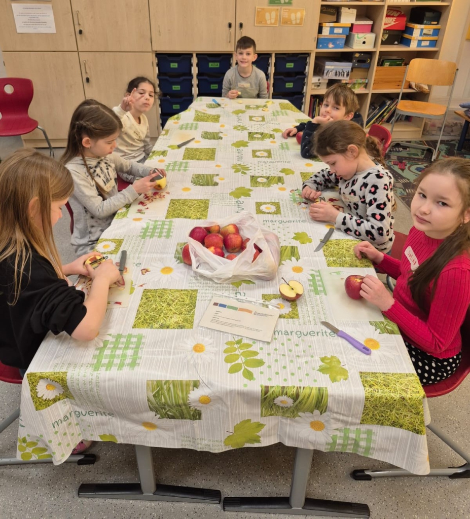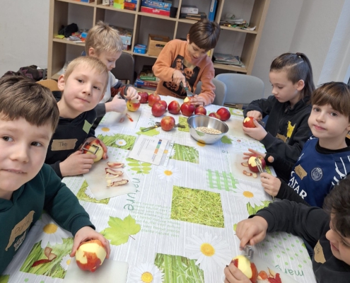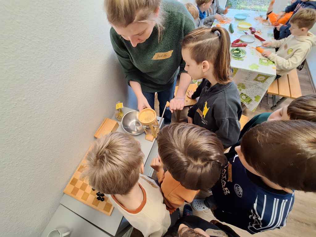 Als Nachspeise schälten und entkernten die Schülerinnen und Schüler Äpfel für ein vorzügliches Apfelmus mit einem Topping aus selbstgequetschten Haferflocken, die mit Sonnenblumenkernen geröstet wurden.