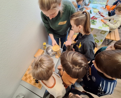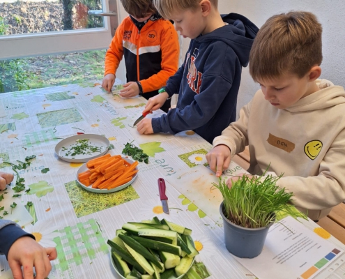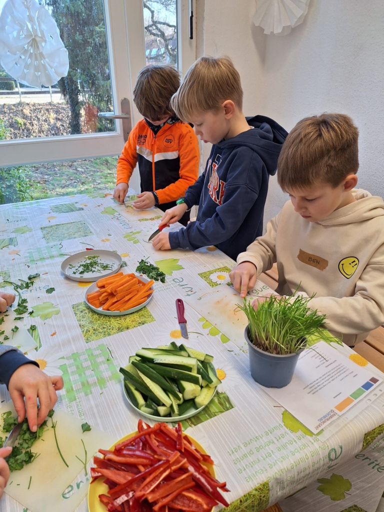 Die Kinder in der Vorspeisengruppe schnippelten Gemüsesticks und rührten dazu einen leckeren Kräuter-Joghurtdip an.