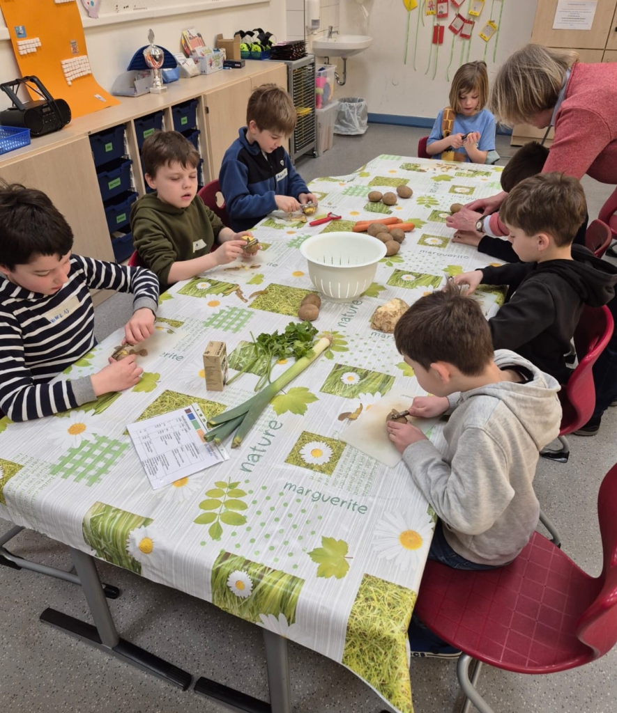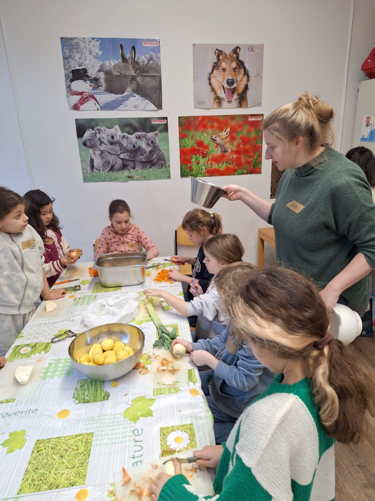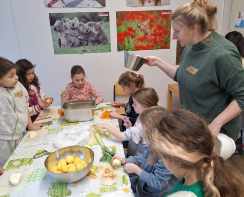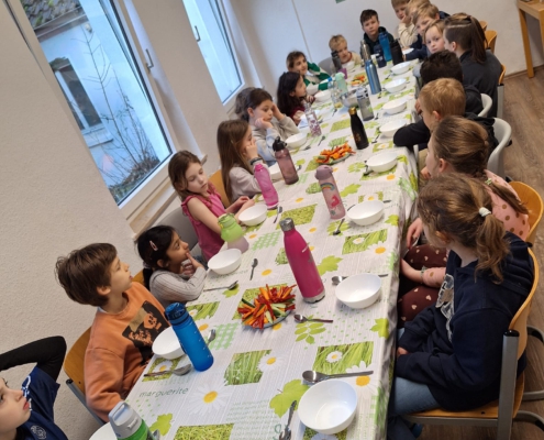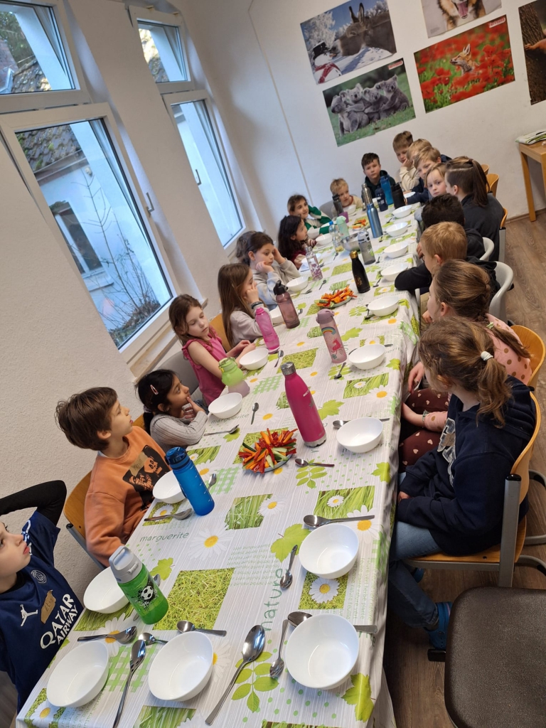 Die Hauptspeise bestand aus einer schmackhaften Gemüsesuppe, für die die Mädchen und Jungen ebenfalls sehr viel verschiedenes Gemüse kleinschnitten.
