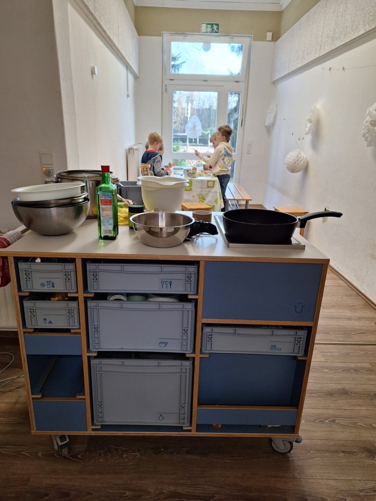Der Wagen ist ausgestattet mit verschiedenen Kochwerkzeugen für zirka 30 Schülerinnen und Schüler, Schürzen, Geschirr, Besteck und Töpfen. Ein Induktionskochfeld ermöglicht die Zubereitung warmer Speisen.
