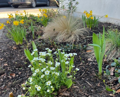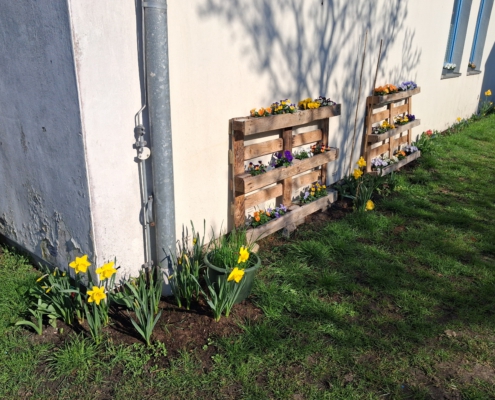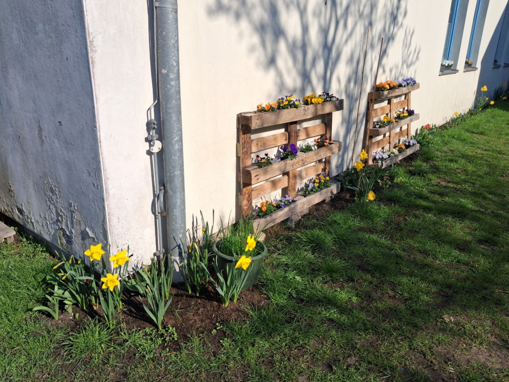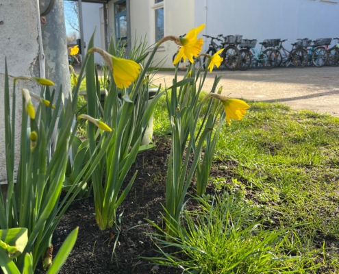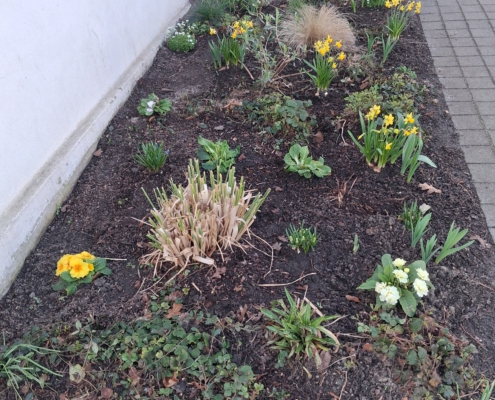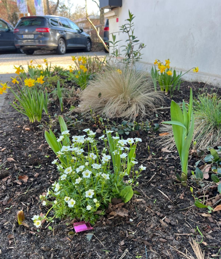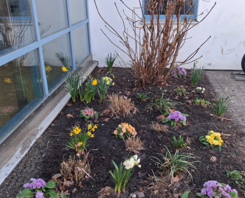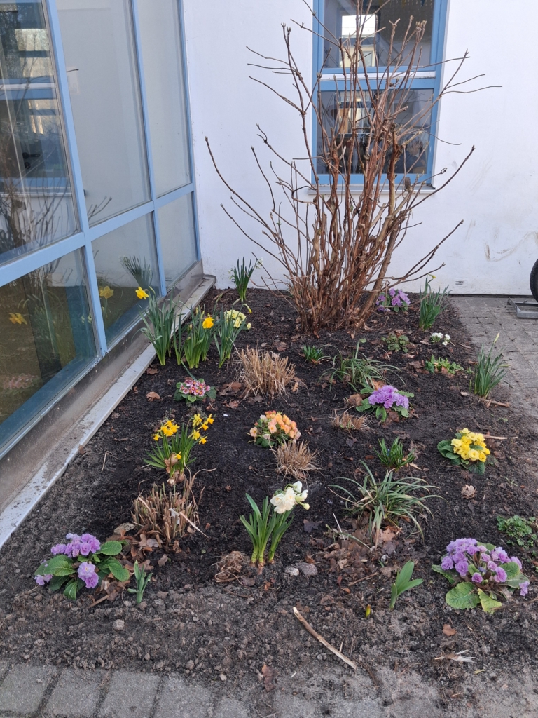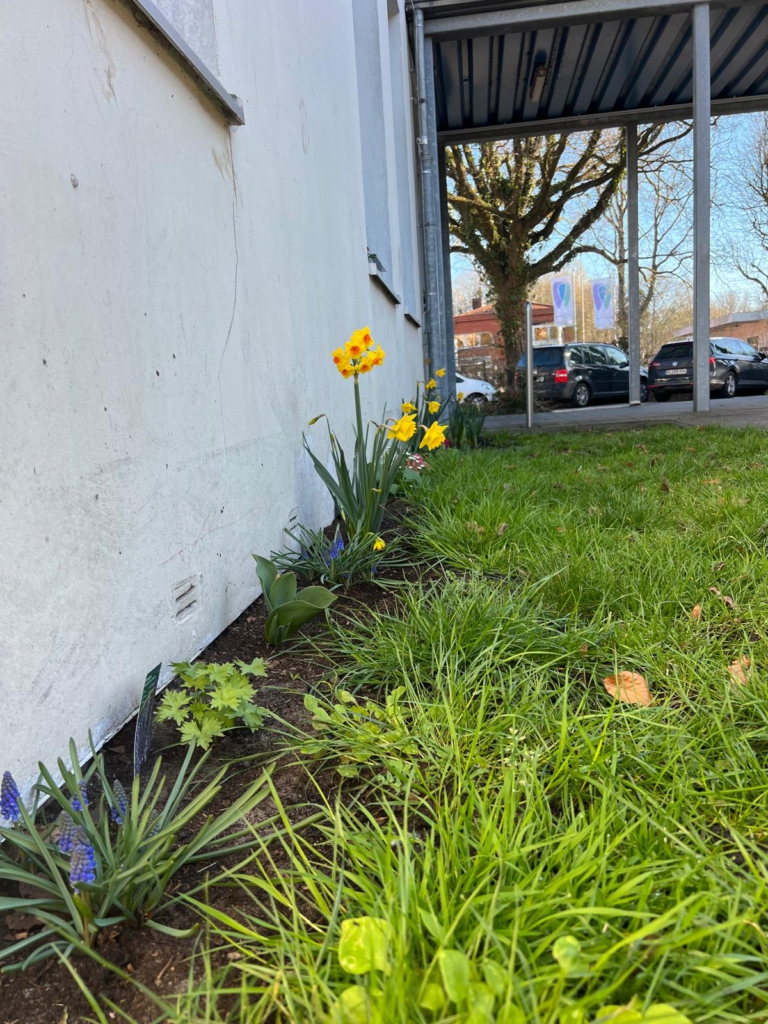 Die Blumenzwiebeln, die wir im letzten Oktober gepflanzt haben, sind endlich aufgegangen. Nun können wir uns über ein richtiges Blütenmeer freuen: Leuchtend gelbe Narzissen, bunte Tulpen, duftende Hyazinthen und fröhliche Stiefmütterchen schmücken unsere Beete und bringen Farbe in den Schulalltag.