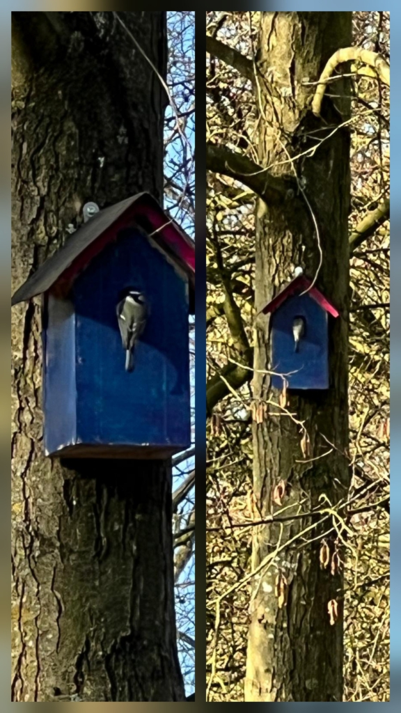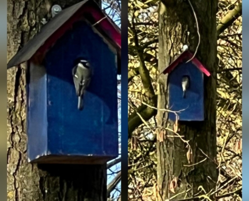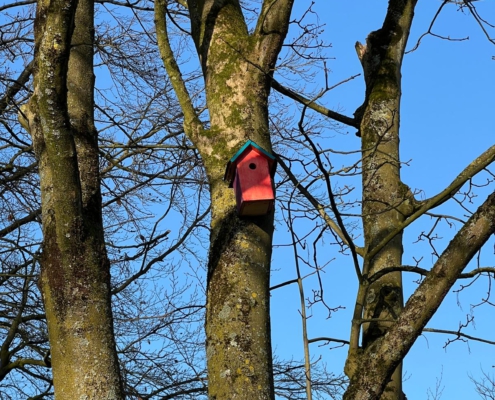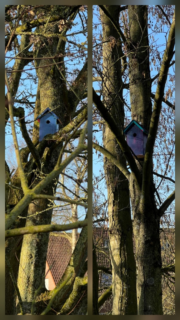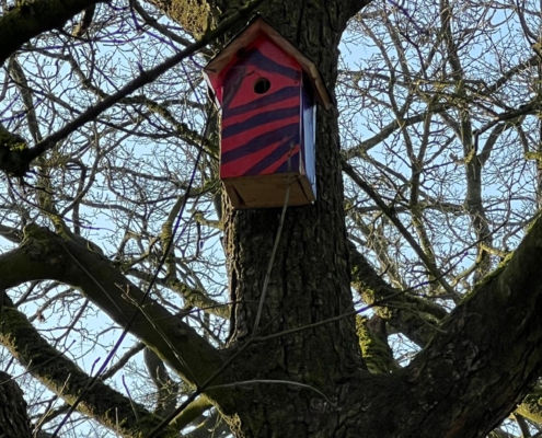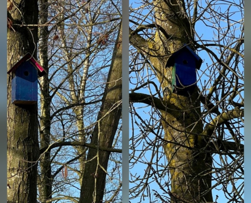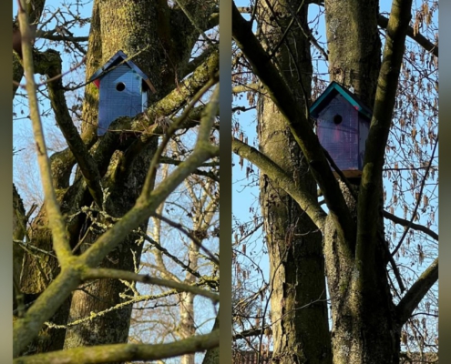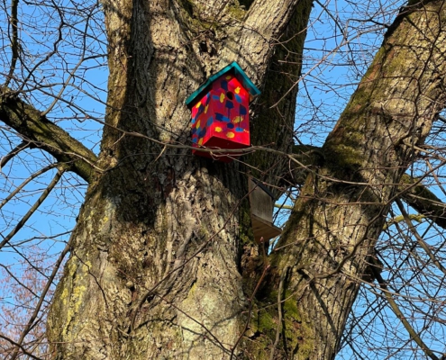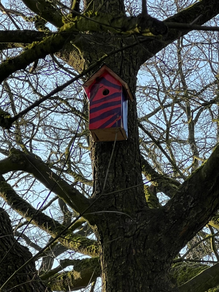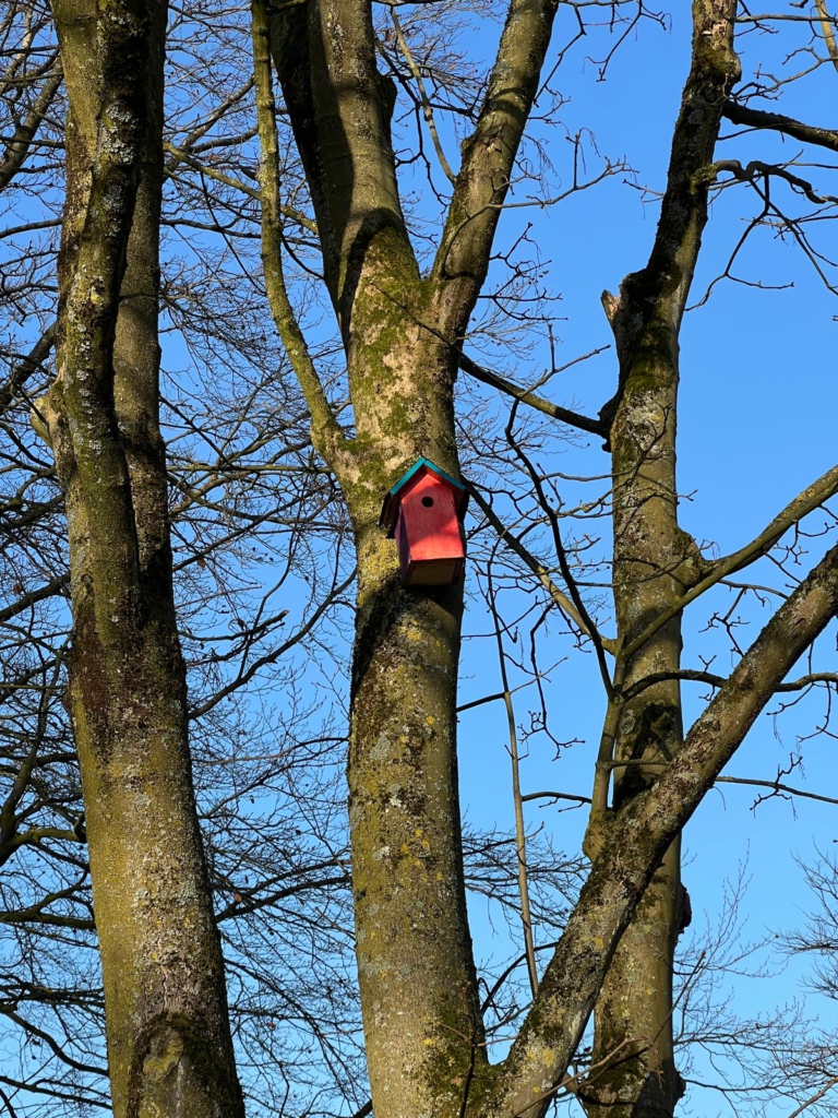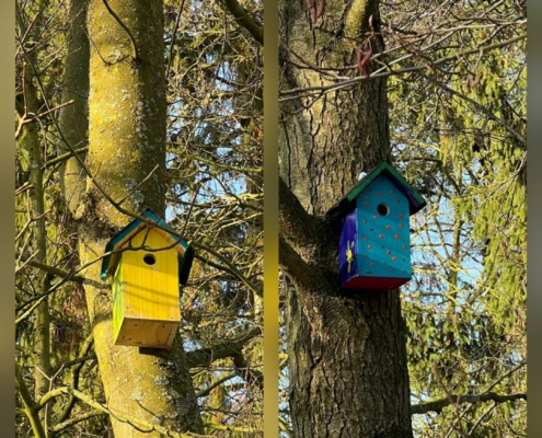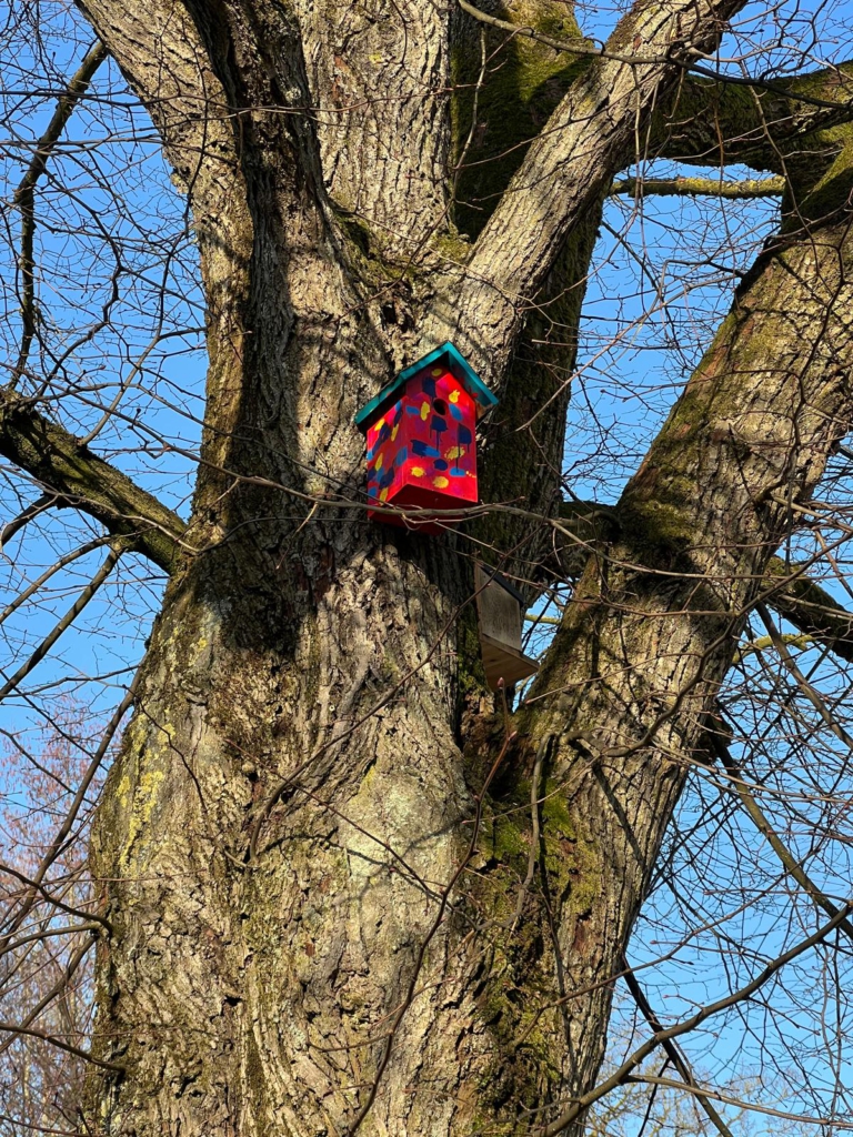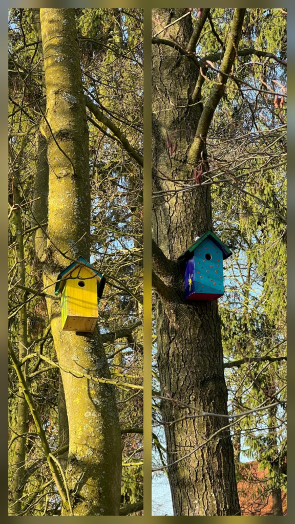 Ein besonderes Projekt hat die Klasse 4a umgesetzt: Sie hat zehn Nistkästen gebaut und bunt gestaltet. Diese hängen nun in den Bäumen auf unserem Schulhof. Und das Beste daran: Die ersten Vögel sind schon eingezogen! Meisen und sogar ein Buchfink haben die Nistkästen entdeckt und werden dort bald ihre Jungen großziehen.