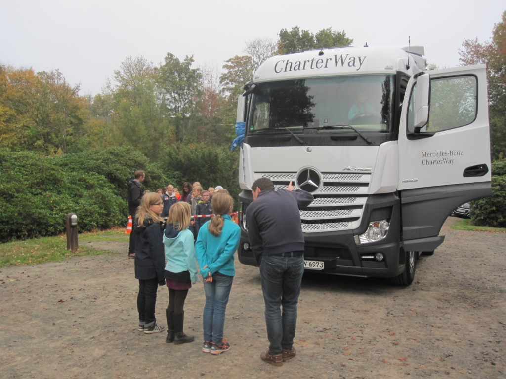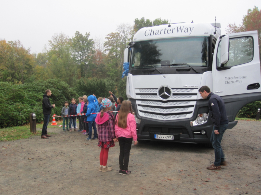 Im Rahmen des Sachkundebereichs Mobilität erhalten unsere Schülerinnen und Schüler auch eine Unterrichtsstunde zum Thema „Toter Winkel“. Anhand von praktischen Übungen sollen den Kindern die Gefahren bewusst gemacht werden, denen sie im Straßenverkehr ausgesetzt sind, wenn sie sich vor oder neben einem Lastkraftwagen befinden. Sie sollen erkennen, welches Blickfeld der Fahrer hat und wie weit sie als Fußgänger oder Radfahrer vom LKW entfernt sein müssen, um vom Fahrer gesehen werden zu können.